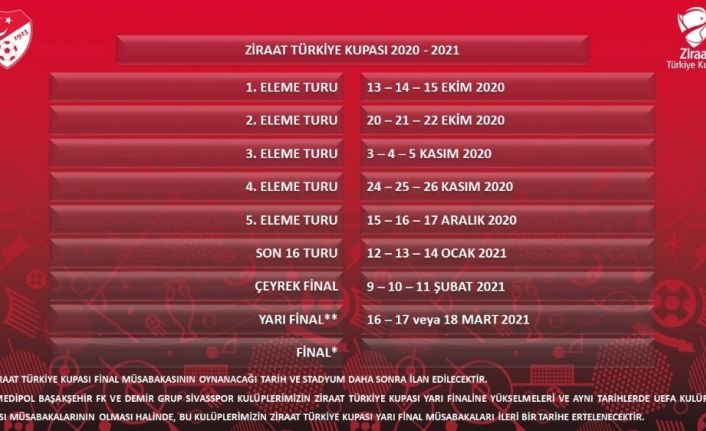 Ziraat Türkiye Kupası’nda 2020 - 2021 sezonu tarihleri, Türkiye Futbol Federasyonu’nun resmi internet sitesinden açıklandı. Planlamaya göre Ziraat Türkiye Kupası 13, 14 ve 15 Ekim’de oynanacak olan 1. Eleme Turu maçları ile başlayacak. Tek maç eleme usulüne göre oynanacak olan Türkiye Kupası’nda final müsabakasının yapılacağı tarih ve stadyum daha sonra ilan edilecek.