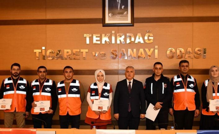Tekirdağ Afet ve Acil Durum Müdürlüğü (AFAD) tarafından düzenlenen saha eğitimlerini tamamlayarak Destek AFAD gönüllüsü olmaya hak kazanan kişiler için sertifika ve kimlik takdim töreni düzenlendi.