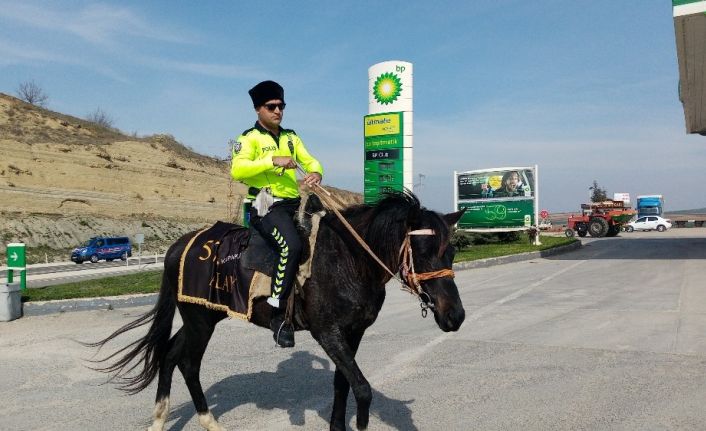 Tekirdağ’ın Malkara ilçesinde trafik polisinin ata binip gezinmesi renkli görüntüler oluşturdu.