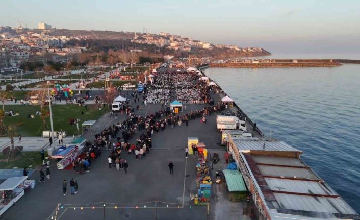 Tekirdağ Büyükşehir Belediyesi tarafından Süleymanpaşa sahil dolgu alanında düzenlenen iftar programına yoğun katılım olurken, self servis yemek dağıtımı nedeniyle uzun kuyruklar oluştu.