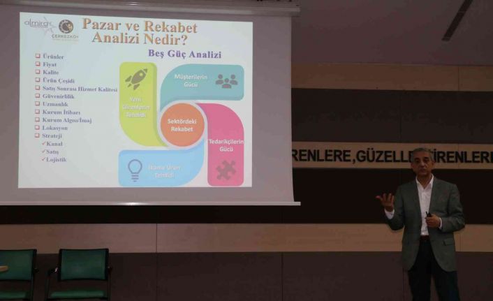 Pazar Analizinin ardından Rekabet Analizi ile ilgili bilgiler veren ve katılımcılara konunun ayrıntılarını anlatan Erdem, “Rekabet Analizi, stratejik araştırma biçimi olarak tanımlanabilir. Ticari açıdan rekabet hâlinde olduğunuz diğer şirketlerin faaliyetlerini, stratejilerini ve bunlara bağlı olarak güçlü ve zayıf yönlerini belirleme amacı taşır. Elde ettiğiniz veriler, kendi güçlü ve zayıf yönlerinizi daha kolay saptamanızı sağlar. Böylelikle alacağınız kararlar ve yapacağınız stratejik hamlelerin, daha isabetli olmasının önünü açar. Günümüzde her geçen daha da fazla önem kazanan e-ticaret faaliyetleri açısından da rekabet analizi büyük önem taşır. Zira internetten yapılan satış sayılarındaki gözle görünür artış, birçok şirketin bu alana yönelmesine neden olmakta ve bu da kaçınılmaz olarak rekabet düzeyini artırmaktadır. Dolayısıyla e-ticarette rakip analizi yapmak, bu alanda çalışmayı düşünen ya da hâlihazırda çalışan her işletme için mutlaka atılması gereken bir adım hâline gelmiştir.” ifadelerini kullandı.