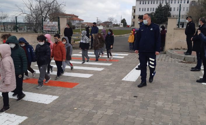 Ergene İlçe Jandarma Komutanlığı ve Ergene Belediyesi Zabıta Müdürlüğü ekipleri tarafından Ulaş Mahallesinde bulunan okulda küçük öğrencilere yaya geçidinden geçme kuralları hakkında bilgiler de verildi.