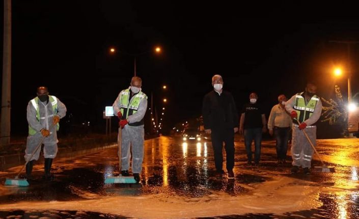 Yeni tip korona virüs ile mücadele tedbirleri kapsamında ilçe genelinde dezenfekte çalışması yürüten Ergene Belediyesi, Sağlık Mahallesinde yer alan Edirne Caddesi ile caddeye bağlı sokakları köpüklü suyla yıkayarak dezenfekte etti. Gece yarısı yapılan çalışmalara Ergene Belediye Başkanı Rasim Yüksel de katıldı.