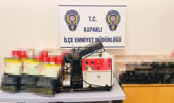 Kapaklı İlçe Emniyet Müdürlüğü’ne bağlı Asayiş Büro Amirliği ekipleri, Pınar Bulvarı üzerinde 54 SD 028 plakalı araçta yaptığı aramada 6 kartonda 375 paket doldurulmuş makaron ele geçirdi. Araçta bulunan Hasan A. ve Şuayip A. gözaltına alındı. Şüphelilerin kaçak tütünlerin tütün sarma makinesi ile yapıldığını söylemesi üzerine belirtilen adreste arama yapıldı. Yapılan aramada 1 adet sigara dolum makinası, 25 karton satışa hazır boş makaron, 78 karton doldurulmuş satışa hazır sigara, 6 kilogram tütün ele geçirildi. Polis ekiplerinin olayla ilgili başlattığı inceleme devam ediyor.