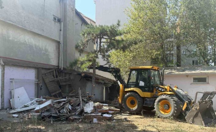 Eski öğretmenevi ekiplerince ek binaların yıkımı başlatıldı. Eklentilerin biri kepçe ile yıkılırken, diğer blok için büyük iş makinesi beklenecek.