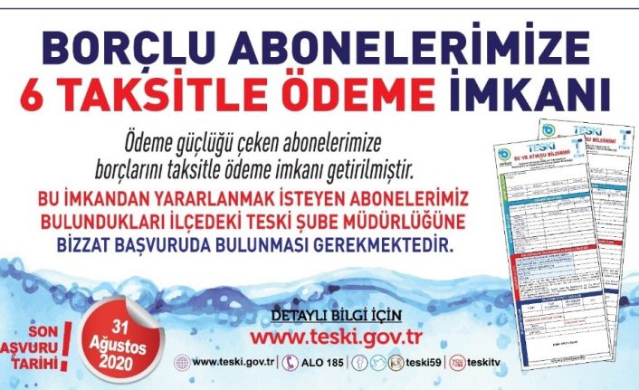 TESKİ Olağan Genel Kurul Toplantısında alınan 2020/17 numaralı kararla yapılan yazılı açıklamada, “Su faturalarını ödeme güçlüğü çeken abonelerimize borçlarını taksitle ödeme imkanı getirilmiştir. 30 Haziran 2020 tarihi itibarıyla borcu bulunan abonelerin borçlarının 6 (altı) aya kadar taksitlendirme yapılmasına, ilk başvuru tarihinin 27 Temmuz 2020 olarak ve son başvuru tarihinin 31 Ağustos 2020 olarak belirlenmesine, üst üste 2 (iki) taksit ödemeyen abonelerin taksitlendirmesinin iptal edilmesine karar verilmiştir” denildi.