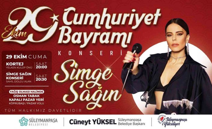 Süleymanpaşa Belediyesi tarafından, Türkiye Cumhuriyeti’nin kuruluşunun 98’inci yıldönümünde, 29 Ekim Cumhuriyet Bayramı dolayısıyla düzenlenen şölende son dönemin sevilen şarkıcılarından Simge Sağın Süleymanpaşalılarla buluşacak.