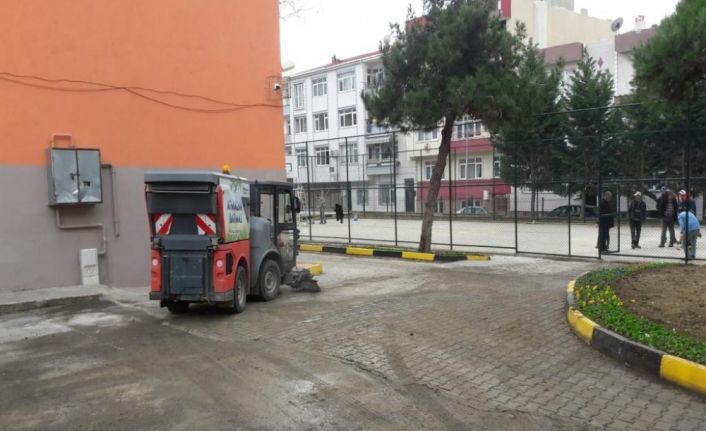 Temizlik İşleri Müdürlüğüne bağlı yıkama ekipleri ve süpürge makinelerinin ilçenin tamamındaki okullarda gerçekleştirdiği çalışmalarda okul bahçeleri tek tek köpüklü suyla yıkanırken süpürge araçları da yıkanan yerlerdeki çöpleri topluyor.