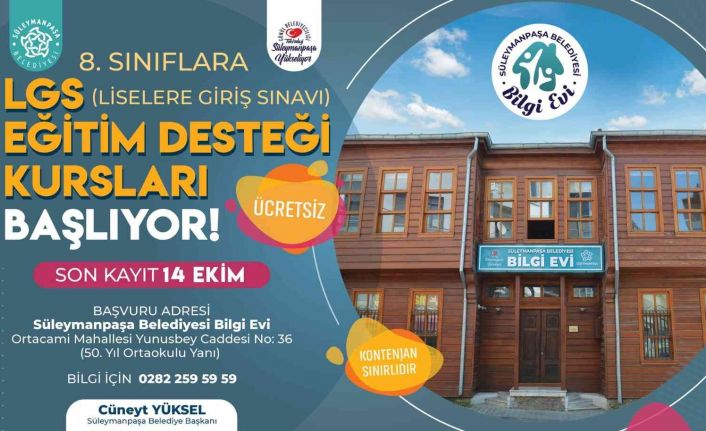 Süleymanpaşa Belediyesi tarafından, 8’inci sınıf öğrencilerine yönelik Liselere Giriş Sınavı (LGS) Eğitim Desteği Kursları başlıyor. Kayıtlar için son gün 14 Ekim.