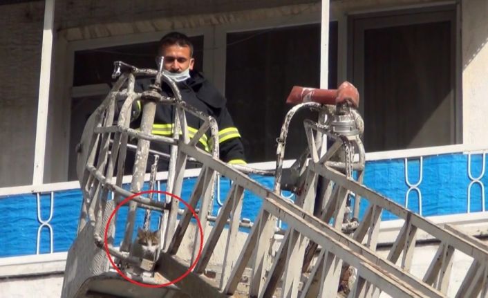 Tokat’ın Turhal ilçesinde balkonda mahsur kalan kedi itfaiye merdiveni ile kurtarıldı.