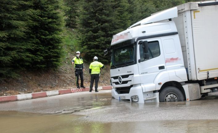 Tokat’ta içme suyu hattının patlaması sonucu çöken yola kamyon saplanarak mahsur kaldı.