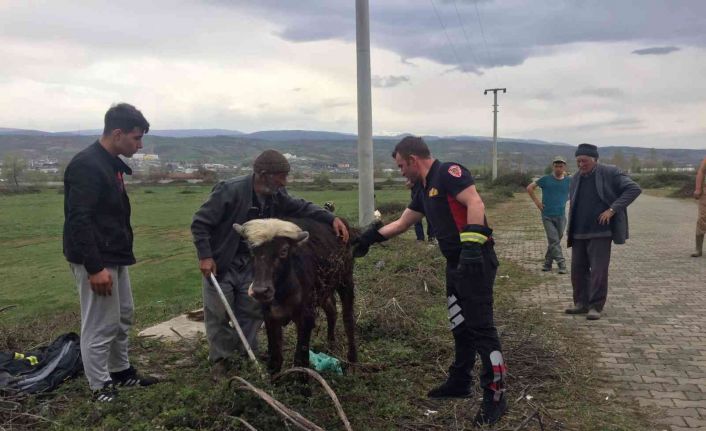 Tokat’ın Erbaa ilçesinde rögara düşen manda yavrusunu itfaiye ekipleri kurtardı.
