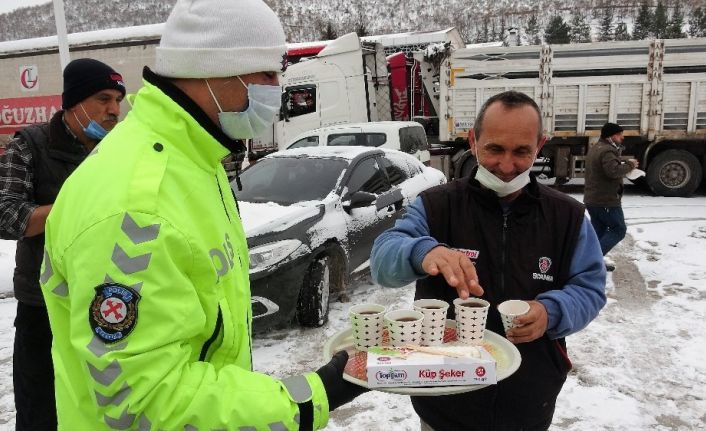 Tokat’ta polis ekipleri tarafından kar yağışı ve buzlanma nedeni ile bekletilen ağır vasıta sürücülerine çay ve simit ikramı yapıldı.