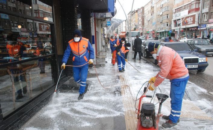 Tokat Belediyesi ekipleri korona virüs tedbirleri kapsamında halkın yoğun olduğu bölgelerde cadde ve sokakları deterjanlı suyla yıkadı