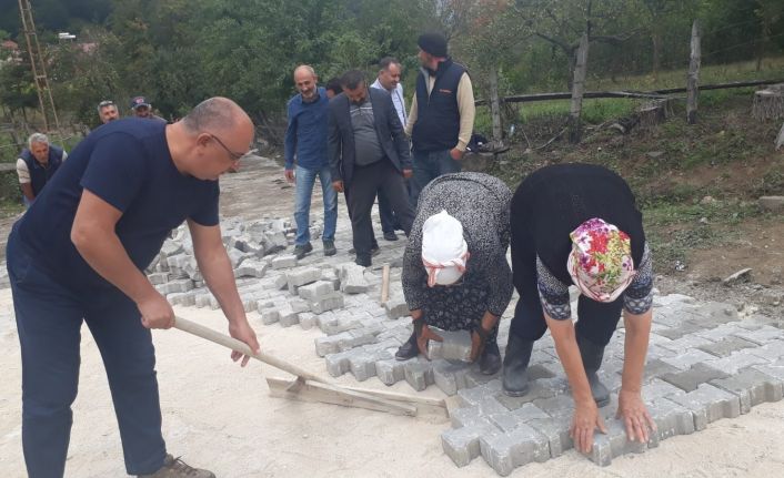 Akgüney Köyünü ziyaret eden Niksar Kaymakamı İlhami Doğan’da eline parke taşlarını alarak, kadınlarla birlikte yolda kilit parke döşemede yardımcı oldu.