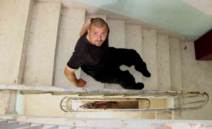 27 yaşındaki engelli Ramazan Taşkın, kirada oturdukları binada asansör olmadığı için dördüncü kattaki evlerine merdivenlerden sürünerek çıkıp iniyor.
