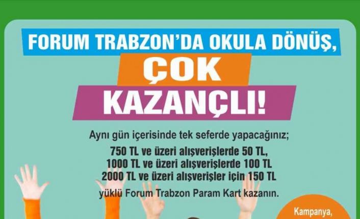 Trabzon ve çevre illerin buluşma noktası Forum Trabzon, okullar başlarken herkese kazançlı bir alışveriş fırsatı sunuyor. Aynı gün içerisinde tek seferde yapılacak 750 TL ve üzeri alışverişlerde 50 TL, bin TL ve üzeri alışverişlerde 100 TL, 2 bin TL ve üzeri alışverişlerde 250 TL yüklü ‘Forum Trabzon Param Kart’ kazandıran kampanya sayesinde ziyaretçiler harcadıkça kazanıyor.