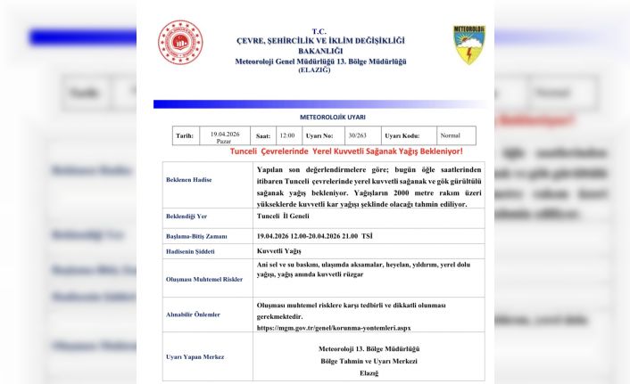 Meteoroloji 13. Bölge Müdürlüğü tarafından yapılan uyarıda, "Yapılan son değerlendirmelere göre; bugün öğle saatlerinden itibaren Tunceli çevrelerinde yerel kuvvetli sağanak ve gök gürültülü sağanak yağış bekleniyor. Yağışların 2000 metre rakım üzeri yükseklerde kuvvetli kar yağışı şeklinde olacağı tahmin ediliyor. Oluşması muhtemel risklere karşı tedbirli ve dikkatli olunması gerekmektedir" denildi.