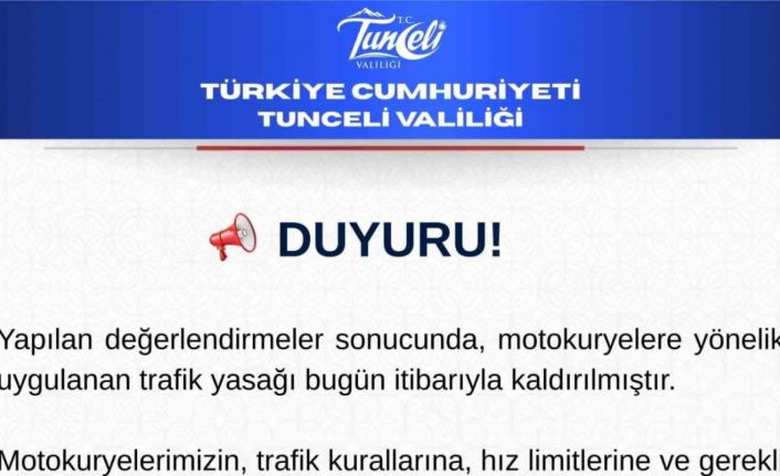 Tunceli’de, olumsuz hava şartları nedeniyle motokuryelere yönelik uygulanan trafik yasağı bugün itibarıyla kaldırıldı.