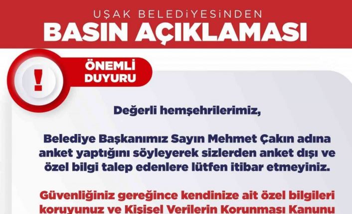 Uşak Belediyesi, bazı kişilerin Başkan Mehmet Çakın adını kullanarak, anket yaptıklarını ve vatandaşların özel bilgilerine ulaştığını, vatandaşların bu oyuna gelmemelerini istedi.