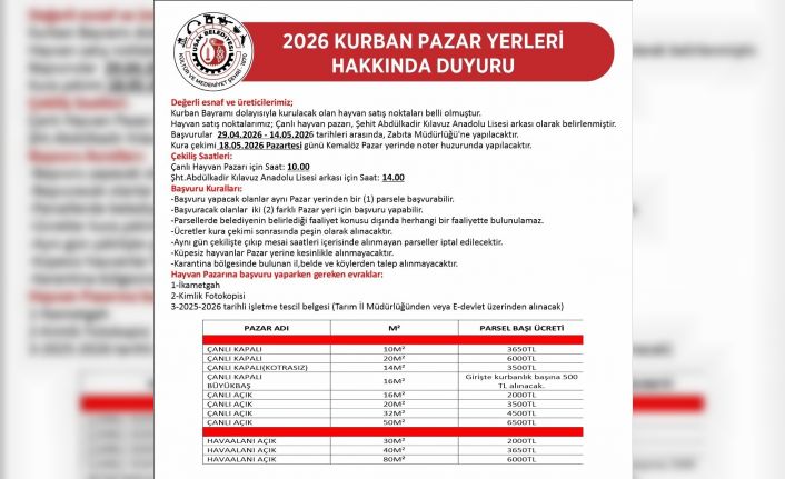 Öte yandan kura çekiminin ardından ücretler peşin olarak tahsil edilecek. Çekilişte hak kazanıp mesai saatleri içerisinde alınmayan parseller ise doğrudan iptal edilecek. Küpesiz hayvanlar pazar yerine alınmayacak, karantina bölgelerinden ise başvuru kabul edilmeyecek.