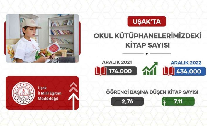 Milli Eğitim Bakanlığı’nın hayata geçirdiği “Kütüphanesiz okul kalmayacak” projesiyle birlikte Uşak’ta İl Milli Eğitim Müdürlüğü de harekete geçti. Yoğun bir şekilde çalışan ekipler, meslek liselerinin atölyelerine kurulan 68 kütüphane ile birlikte amacına ulaştı ve kentte kütüphanesiz okul kalmadı. Bununla birlikte çalışmalar dahilinde geçtiğimiz sene 174 bin kitap ile öğrenci başına düşen kitap sayısı 2.76 olurken çalışmalar sonucunda 2022 senesinde kitap sayısı 434 bine ulaşırken öğrenci başına düşen kitap sayısı ise 7.11 oldu.