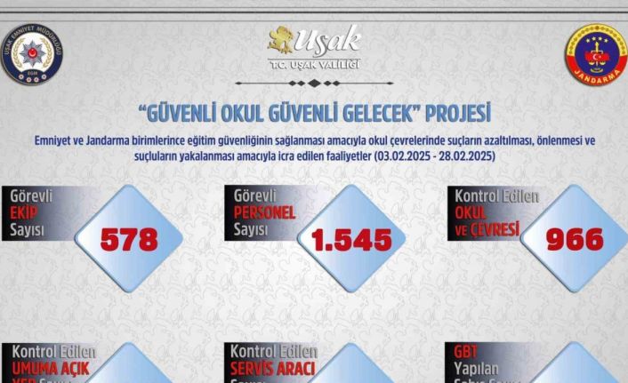 Edinilen bilgiye göre, 3 Şubat ile 28 Şubat tarihleri arasında polis ve jandarma tarafından okul çevreleri ile okul servislerinde denetim yapıldı. Uşak İl Emniyet Müdürlüğü ve İl Jandarma Komutanlığı bağlı toplam 578 ekip ve bin 545 personelle, 966 okul çevresi, 730 umuma açık yer, 693 okul servis aracı denetlendi. Öte yandan okul çevresi ve umuma açık yerlerde bulunan toplam 9 bin 853 kişi sorgulandı.