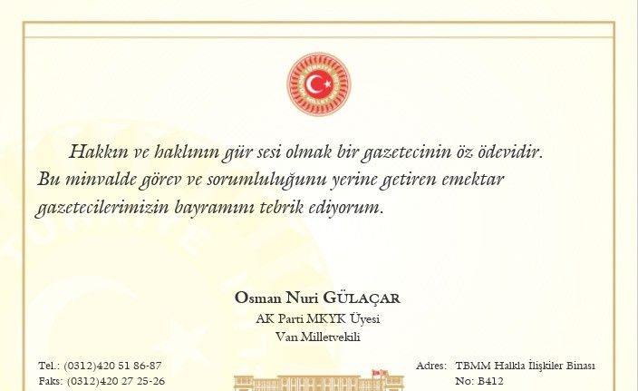AK Parti 27.Dönem Van Milletvekili, AK Parti MKYK Üyesi, TBMM İnsan Haklarını İnceleme Komisyonu Sözcüsü. Türkiye-İran Parlamentolararası Dostluk Grubu Başkanı Osman Gülaçar mesajında, “Halkın haklının gür sesi olmak bir gazetecinin öz ödevidir. Bu minvalde görev ve sorumluluğunu yerine getiren emektar gazetecilerimizin bayramını tebrik ediyorum” dedi.