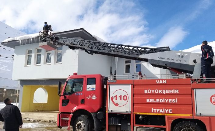 Van Büyükşehir Belediyesi itfaiyesi, okul binalarının çatılarında oluşan ve öğrenciler için tehlike arz eden buz sarkıklarını temizliyor.