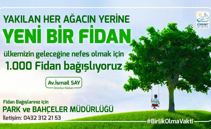 Edremit Belediyesi bir taraftan kentte meydana gelen sel felaketleriyle uğraşırken diğer taraftan yanan ormanlık alanların yeniden yeşillendirilmesi için bin fidan bağışında bulunarak kampanya başlattı. İHA muhabirine konuşan Belediye Başkanı İsmail Say, Edremit Arama Kurtarma Ekibinin (EDAK) afetlerin yaşandığı bölgelerde canla başla çalıştığını ifade ederek, yangın nedeniyle zarar gören ağaçların yerinde yeni fidanlar dikilip gelecek nesillere ulaştırılacağını söyledi. Başkan Say, “Yaklaşık bir hafta önce Akdeniz Bölgesinde başlayan ve birkaç bölgede devam eden yangınlar var. Tarım ve Orman Bakanlığımız ile Orman Genel Müdürlüğümüzün bütün birimlerinin çalışmasıyla bu orman yangınları söndürülmeye çalışılıyor. Tarihimizin en büyük felaketiyle karşı karşıyayız. Buradan felaketi yaşayan vatandaşlarımıza geçmiş olsun dileklerimi iletiyorum” dedi.