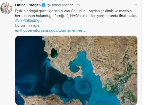 Finale kalan Van Gölü fotoğrafı için oy kullanarak Twitter hesabından destek isteyen Emine Erdoğan, “Eşsiz bir doğal güzelliğe sahip Van Gölü’nün uzaydan çekilmiş ve mavinin her tonunun bulunduğu fotoğrafı, NASA’nın online yarışmasında finale kaldı. #VanGölünüOyla” paylaşımı yaptı.