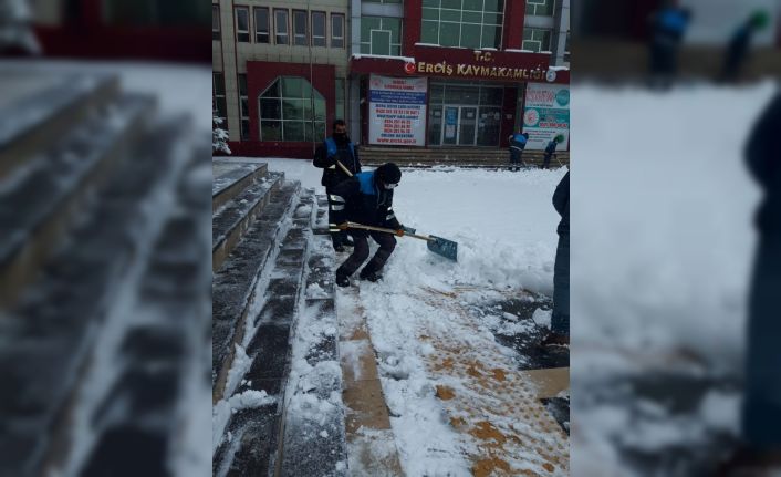 Van’ın Erciş ilçesinde etkili olan kar yağışının ardından belediye ekipleri tarafından yollarda ve kaldırımlarda temizlik çalışması yapıldı.