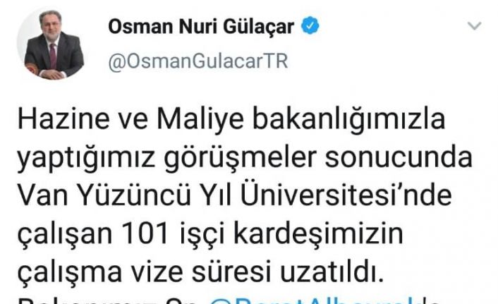 AK Parti MKYK Üyesi ve Van Milletvekili Osman Nuri Gülaçar, Van Yüzüncü Yıl Üniversitesi’nde (YYÜ) çalışan 101 işçinin çalışma vizesinin uzatıldığını söyledi.