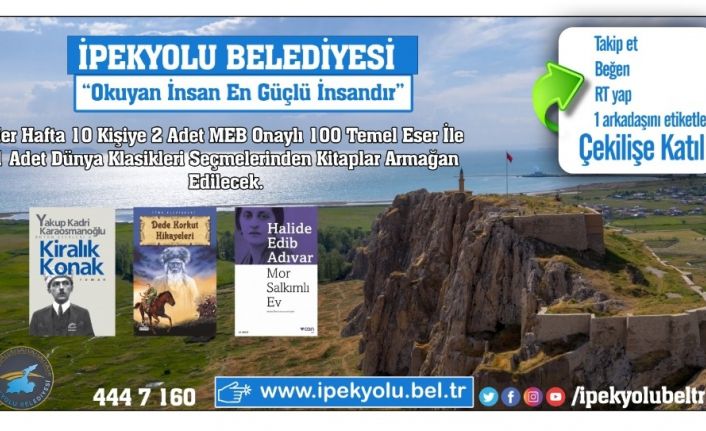 İpekyolu Belediyesi Basın Yayın ve Halklar İlişkiler Müdürlüğü, vatandaşlara okuma alışkanlığını kazandırmak ve okumayı sevdirmek, Türk ve dünya klasiklerine ilgiyi arttırmak için “Okuyan insan en güçlü insandır” sloganıyla sosyal medya üzerinden kitap çekilişi düzenleyecek. İpekyolu Belediyesinin resmi twitter hesabı @ipekyolubeltr hesabını takip eden, bir arkadaşını etiketleyen ve beğeni ile retweet eden kişiler arasından her hafta 10 kişiye 3 adet MEB onaylı 100 temel eser ile dünya klasikleri seçmelerinden kitaplar hediye edilecek.