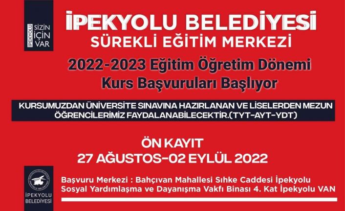 İpekyolu Belediyesinden yapılan açıklamada, 2022-2023 eğitim öğretim yılı hazırlıklarını tamamlayan merkezin, 27 Ağustos 2022 Cumartesi günü yeni dönem kurs başvuruları için kapılarını açacağı belirtildi. Açıklamada, “İpekyolu ilçe sınırlarında ikamet eden öğrencilerin faydalanabileceği merkezde, öğrencilerin sosyo-ekonomik yapısı gözetilecek ve kesin kayıtlarda ise öğrencinin diploma başarı puanının yüzde 20’si, 2022 TYT puanının yüzde 30’u, merkezce yapılacak sınav puanının yüzde 50’si toplanarak hesaplanacak. Birinci dereceden şehit ve gazi yakınları (anne, baba, kardeş) ise hiçbir koşul aranmadan kurslardan faydalanacak. Başvuruların Bahçıvan Mahallesi Sıhke Caddesi İpekyolu Sosyal Yardımlaşma ve Dayanışma Vakfı binası 4. kat İpekyolu Belediyesi Sürekli Eğitim Merkezine şahsen kabul edileceği merkezde, ön kayıt için adaylardan yanlarında bulundurmaları gereken evraklar ise kimlik fotokopisi, diploma fotokopisi veya E-devletten alınacak mezuniyet belgesi, 2022 YKS Sonuç Belgesi, E-devlet şifresi şeklinde sıralandı. Aday kursiyerlerin kurs merkezlerinden yaptıkları başvurular ön kayıt niteliğinde olup kesin kayıt niteliği taşımayacaktır. Kesin kayıt için kayıt yaptıracak kursiyerlerin puanlama sonucunda başarı notu en yüksekten en düşüğe doğru asıl ve yedek adaylar, puan sırasına göre ilan edilen kontenjan dahilinde öğrenciliğe kabul edilecektir. Öğrenciliğe kabul edilen kesin kayıt hakkı kazanan öğrencilerden istenilecek evraklar ise diploma fotokopisi (E-devlet üzerinden alınabilir), 1 adet fotoğraf, yerleşim yeri belgesi (E-devlet üzerinden alınabilir), YKS Sonuç Belgesi (2022 yılına ait), nüfus cüzdan fotokopisi şeklinde olacaktır. Merkezce yapılacak sınav sonuçları ön başvurular alındıktan sonra instagram (ipekyolu_sem) adresi üzerinden ve kurumun ilan panosunda ayrıca duyurulacak. Asıl adaylardan kayıt yaptıramayanların yerine yedek adaylar sırasıyla alınacak. Sınırlı sayıda olan kontenjanların son başvuru tarihi ise 2 Eylül 2022’dir” denildi.
