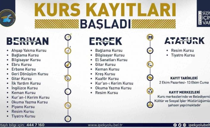 İpekyolu Belediyesinden yapılan açıklamada, “Sosyal belediyecilik çerçevesinde İpekyolu Halk Eğitim Merkezi Müdürlüğünün katkıları ile İpekyolu Belediyesi Kültür ve Sosyal İşler Müdürlüğünün koordinasyonunda düzenlenen sanat ve mesleki eğitim kursları hemşerilerimize ücretsiz olarak veriliyor. Kültür ve Sosyal İşler Müdürlüğüne bağlı Erçek Yaşam Merkezi, Berivan Kültür ve Sanat Merkezi, Atatürk Sanat Galerisi’ndeki kursları çeşitli branşlarla hizmet vermeye devam ediyor. Erçek Yaşam Merkezimizde; keman, resim, kuaförlük, kreş, el sanatları, okuma yazma, Kuran’ı Kerim, bağlama, bilgisayar ve gitar kursları verilirken, Berivan Kültür ve Sanat Merkezimizde; piyano, gitar bağlama, ahşap yakma, resim, İngilizce, ebru sanatı, bilgisayar, keman, erbane, geri dönüşüm, Kuran’ı Kerim, karakalem, ilk yardım, tiyatro ve okuma yazma kursları veriliyor. Ayrıca Atatürk Sanat Galerisi’nde de resim ve tiyatro branşlarında kurslarımız yer alıyor. Kurslardan faydalanmak isteyen hemşerilerimiz 2-13 Ekim 2023 tarihleri arasında kurs merkezlerimize ve belediyemizin Kültür ve Sosyal İşler Müdürlüğüne giderek kimlik fotokopisi ile şahsen kayıt yaptırabilirler. Vatandaşların kültürel, sanatsal ve sosyal gelişimini destekleyen kurslarla her kesime hitap eden sosyal belediyecilik anlayışıyla hizmetlerine devam edecek” denildi.
