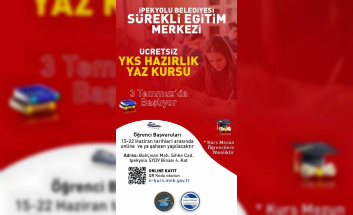 İpekyolu Belediyesinden yapılan açıklamada, ilçede üniversite sınavına girecek öğrencilerin yaz tatillerini verimli bir şekilde geçirebilmeleri amacıyla İpekyolu Kaymakamlığı ve belediyesi destekleriyle ücretsiz yaz kursu başlatılacağı belirtildi. Açıklamada, “Temel Yeterlilik Testi (TYT), Alan Yeterlilik Sınavı (AYT), Yabancı Dil Testi (YDT) için öğrencilere destek olmak amacıyla oluşturulan yaz kurs programlarından mezun gençlerin ücretsiz olarak faydalanabilecek. Sınırlı kontenjanlarla verilecek olan kurslardan faydalanmak isteyen öğrencilerin, Van ili İpekyolu ilçesi sınırlarında ikamet etmeleri yeterli olacaktır. Birinci dereceden şehit ve gazi yakınları (anne, baba, kardeş) ise hiçbir şart aranmadan ücretsiz yaz kursundan faydalanabilecektir. Ön başvurular 15 Haziran 2023 tarihinde başlayacak olup, başvurular online veya şahsen yapılacaktır. Kursların ön başvuru tarihlerinin son günü ise 22 Haziran 2023 Perşembe günü mesai bitiminde sona erecek. Online başvuru için https://e-kurs.meb.gov.tr/Main.aspx, şahsen başvuru için de Bahçıvan Mahallesi Sıhke Caddesi İpekyolu Sosyal Yardımlaşma ve