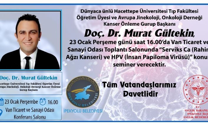 İpekyolu Belediyesi ile İpekyolu Sağlık Müdürlüğü koordinasyonunda, Hacettepe Üniversitesi Tıp Fakültesi Öğretim Üyesi ve Avrupa Jinekoloji, Onkoloji Derneği Kanser Önleme Grup Başkanı Doç. Dr. Murat Gültekin, Van halkıyla buluşuyor. 23 Ocak Perşembe günü saat 16.00’da Van Ticaret ve Sanayi Odasının toplantı salonunda ( İskele Caddesi Üzeri) düzenlenecek olan ServiksCa (Rahim Ağzı Kanseri) ve HPV (İnsan Papiloma Virüsü) konulu ücretsiz seminere, tüm halkın davetli olduğu belirtildi.