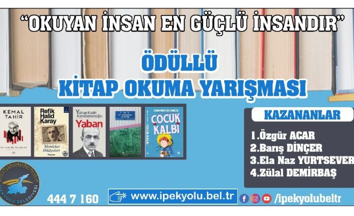 Yarışmada 76 doğru ile Özgür Acar birinci, 68 doğru ile Barış Dinçer ikinci, 68 doğru ile (süre baz alınarak) Ela Naz Yurtsever üçüncü, 67 doğru ile Zülal Demirbaş ise dördüncü oldu. Yarışmada dereceye giren birinciye laptop, ikinciye tablet, üçüncüye fotoğraf makinesi, dördüncüye ise bisiklet verilecek. Kitap okuma yarışmasına katılan herkesin www.sinav.ipekyolu.bel.tr sitesi üzerinden kullanıcı adı ve şifreleriyle sınav sonuçlarına ulaşabilecekleri belirtildi.