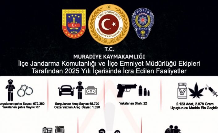 Muradiye Kaymakamlığından yapılan açıklamada, gerçekleştirilen denetim ve operasyonlar kapsamında, yıl boyunca 672 bin 360 şahıs sorgulanırken, 87 kişinin de yakalandığı belirtildi. Açıklamada, "Uygulamalarda 65 bin 720 araç sorgulandı, kural ihlali yaptığı tespit edilen bin 320 araca cezai işlem uygulandı. Ekiplerin çalışmaları neticesinde 22 adet silah ele geçirilirken, 2 bin 123 adet ve 2 bin 878 gram uyuşturucu maddeye el konuldu. Ayrıca 33 bin 986 paket gümrük kaçağı sigara ele geçirildi. Yürütülen çalışmalar kapsamında 28 kayıp şahıs bulunurken, bin 186 düzensiz göçmen ile 279 organizatör yakalandı. Muradiye’de görev yapan kahraman jandarma ve emniyet teşkilatları, suç ve suçlularla mücadele kapsamında ilçede huzur ve güven ortamının korunması için çalışmalarını kararlılıkla sürdürecek" denildi.