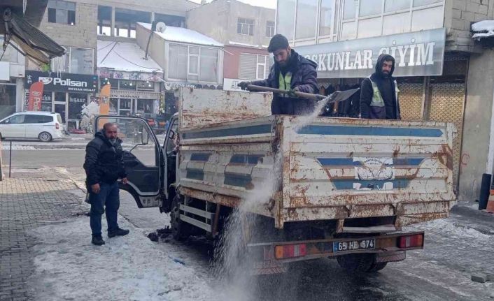 Van’ın Özalp Belediyesi ekipleri, etkili olan soğuk hava nedeniyle buzlanan yol ve kaldırımlarda tuzlama çalışması yaptı.
