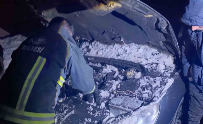 Van’ın Erciş ilçesinde seyir halindeki otomobilin yanan motoruna karla müdahale ettiler.