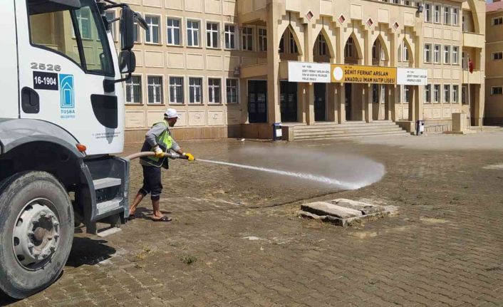 Van’ın Tuşba Belediyesi, öğrencilerin daha temiz ve nezih bir ortamda eğitim-öğretim görmelerini sağlamak amacıyla merkez mahallelerde bulunan tüm okulların bahçelerini tazyikli su ile yıkıyor.