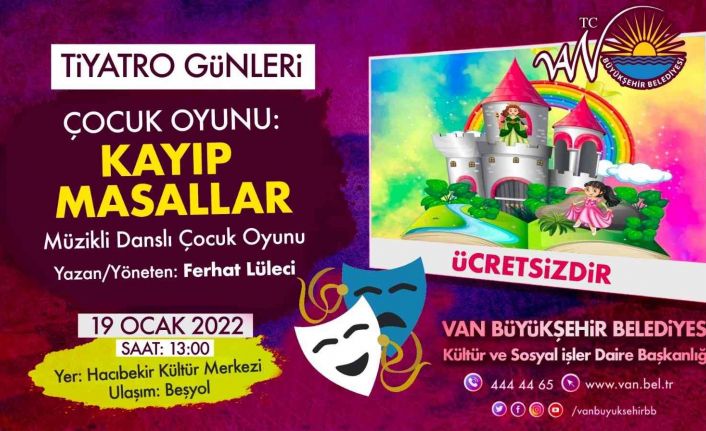 Çocuk ve gençlerin gelişimine katkıda bulunmak için çeşitli sanatsal ve kültürel etkinlikler düzenleyen Van Büyükşehir Belediyesi, merkez ve ilçelerde yapmış olduğu çalışmaları sürdürüyor. Bu kapsamda Kültür ve Sosyal İşler Dairesi Başkanlığı Hacıbekir Mahallesi Kültür Merkezinde çocuklara yönelik müzikli danslı çocuk oyunu düzenleyecek. Kayıp Masallar isimli çocuk tiyatrosu 19 Ocak saat 13.00’te ücretsiz olarak izleyicisi ile buluşacak.