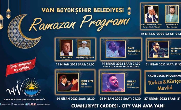 11 ayın sultanı, rahmet ve bereket ayı Ramazan, Büyükşehir Belediyesi Kültür ve Sosyal İşler Dairesi Başkanlığının düzenlemiş olduğu bir birinden güzel programlarla devam ediyor. Ramazan ayına özel hazırlanan Nisan ayı kültür-sanat takvimi çerçevesinde Cumhuriyet Caddesi üzerindeki etkinlik alanında düzenlenen Ramazan etkinliklerinde ilahi dinletileri,Tasavvuf Musikisi, Kur’an-ı Kerim Tilavetleri ile birbirinden değerli isimler Vanlılar ile buluşacak.