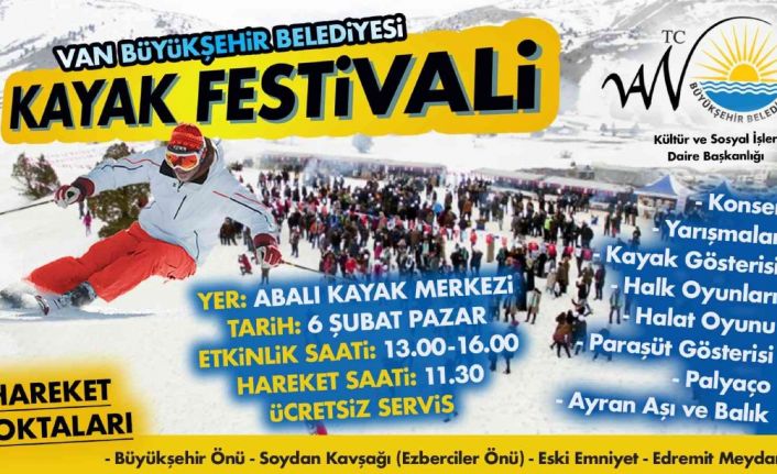 Van Büyükşehir Belediyesinden yapılan açıklamada, kentte kayak turizmini canlandırmak için “Kayak Festivali” düzenleneceği belirtilerek, “Kültür ve Sosyal İşler Dairesi Başkanlığı organizasyonunda düzenlenecek olan ‘Kayak Festivali’ 06 Şubat Pazar günü 13.00- 16.00 saatleri arasında Gevaş Abalı Kayak tesislerinde yapılacak. Festival alanına Edremit Meydanı, Soydan Kavşağı, büyükşehir belediyesi hizmet binası önü ve eski emniyet binası önünden saat 11.30’da hareket edilecek. Festival alanında kayak gösterisi, konser, halk oyunları, halat çekme yarışı ve kızak çekme yarışı gibi etkinlikler yapılacak. Yine festival sonunda katılımcılara ekmek arası Van balığı, ayran aşı, sıcak çay ve çorba ikramın da bulunulacak” denildi.