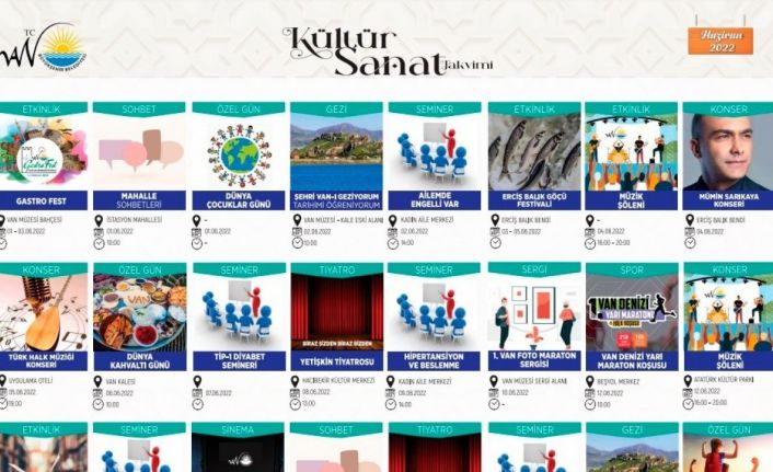 Van Büyükşehir Belediyesi, hazırlamış olduğu kültür sanat takvimiyle her ay birbirinden farklı etkinlikler düzenliyor. Oluşturulan kültür sanat takvimiyle yine haziran ayında; festivaller, şiir programları, sinema gösterimleri, seminerler, sergiler, doğa yürüyüşleri ve kadın programları düzenlenecek.