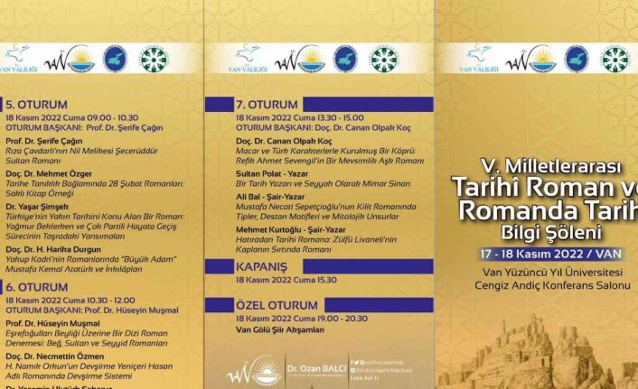 Van Büyükşehir Belediyesinden yapılan açıklamada; Van Valiliği, Van Büyükşehir Belediyesi, YYÜ ve Türkiye Yazarlar Birliği işbirliğinde düzenlenecek olan bilgi şöleninin 17-18 Kasım 2022 tarihlerinde Van YYÜ toplantı salonunda gerçekleştirileceği belirtilerek, “Van Valisi ve Büyükşehir Belediye Başkan Vekili Ozan Balcı’nın açılış konuşmasını gerçekleştireceği bilgi şöleninde, tarihin eski çağlarından beri birçok medeniyete ev sahipliği yapan ve romanlara konu olan ilimiz ve ülkemizdeki tarih-roman ilişkisi tüm yönleri ile ele alınacak. Beşincisi düzenlenen, iki gün ve yedi oturumdan oluşan şölende, aynı zamanda aktüel bir konu olan tarihi roman türü de bütün yönleriyle ele alınacak” denildi.