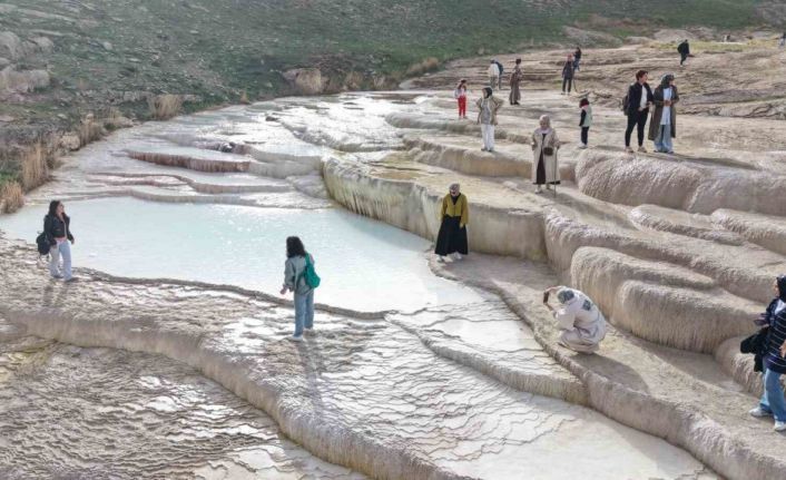 Van’ın Başkale ilçesinde bulunan ve Pamukkale’yi andıran görüntüsüyle yerli ve yabancı turistlerin uğrak mekanları arasında yer alan travertenler ziyaretçilerini ağırlıyor.