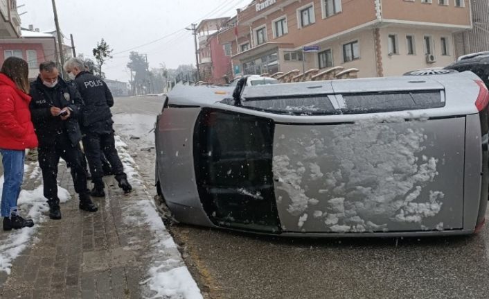 Yalova’da karlı zeminde yokuştan inmeye çalışan otomobil, kayarak ağaca çarpıp takla attı.